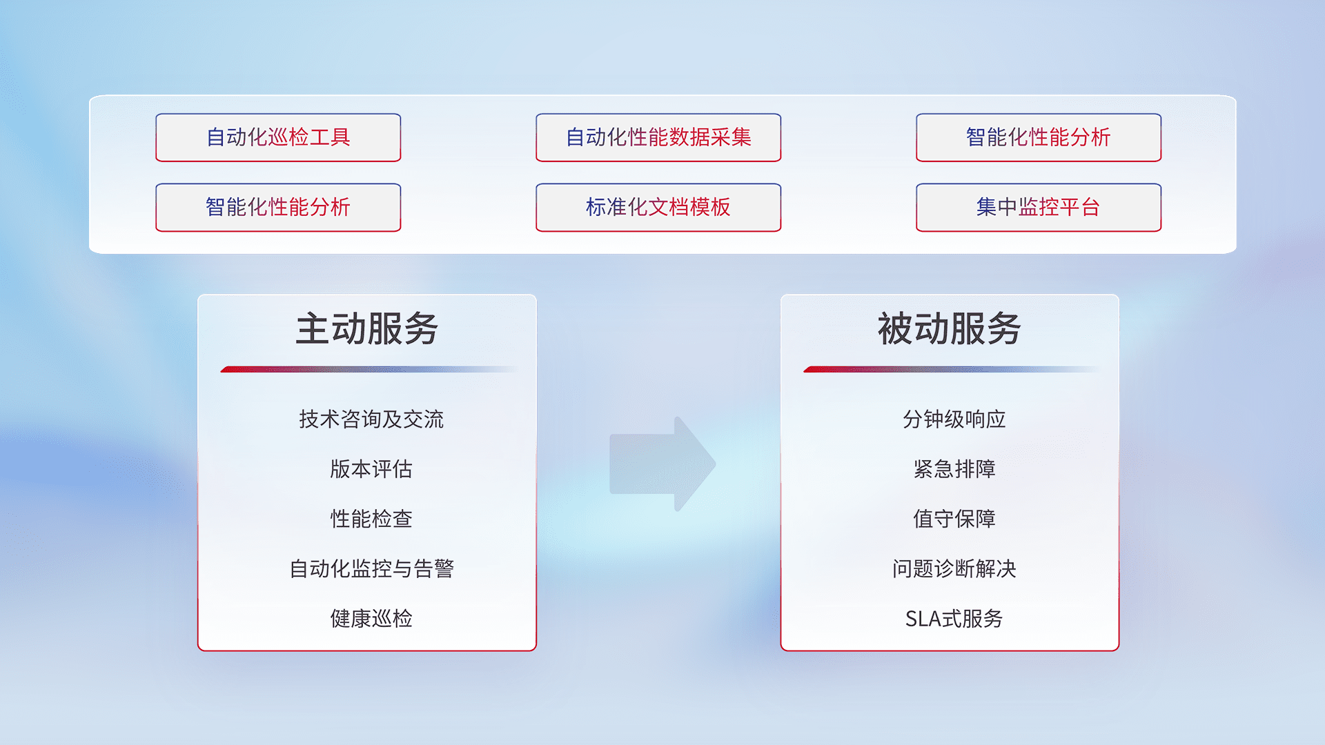 智能化工具和标准化文档,,,保障服务质量,,,提供主动服务(包含技术咨询、、、、版本评估、、、性能检查、、、自动化监控与告警、、健康巡检)和被动服务包含(分钟级响应、、紧急排障、、、、值守保障、、、问题诊断解决、、、、SLA服务)。。