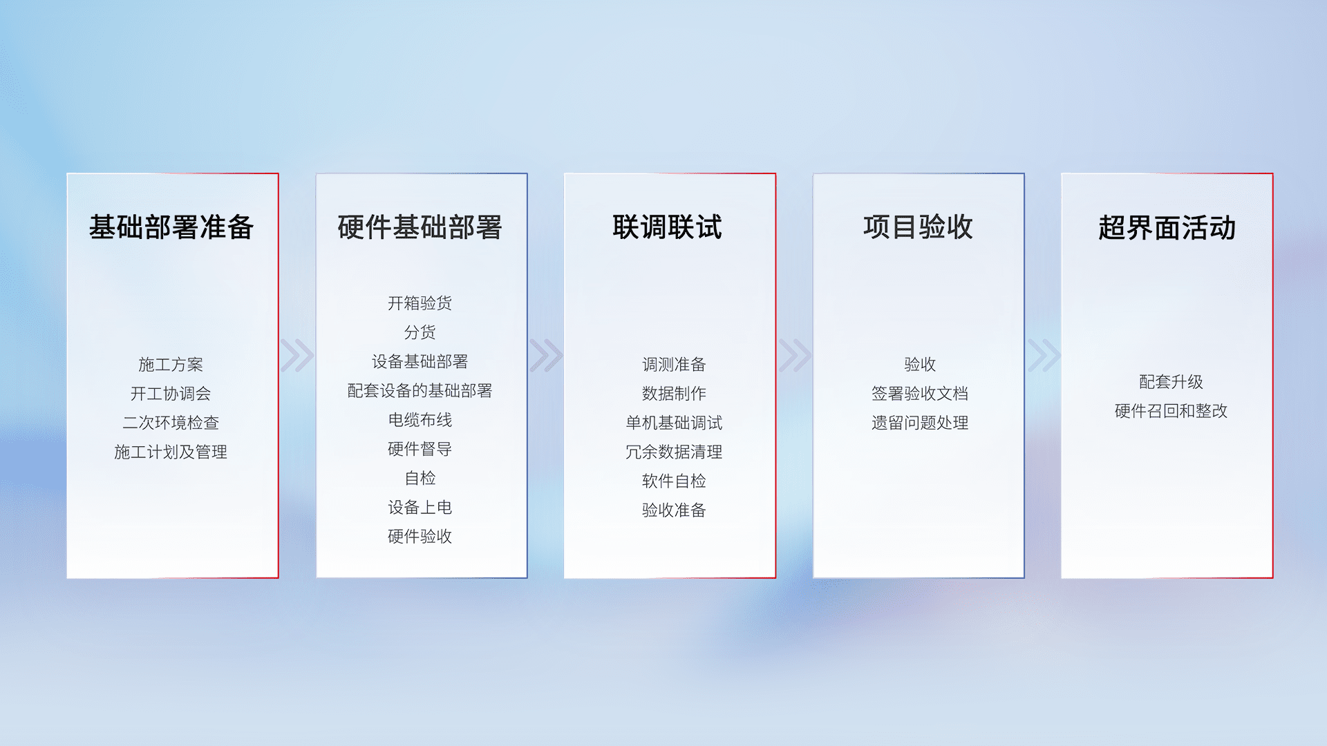 从基础部署准备、、、、硬件基础部署、、、联调联试、、、、项目验收、、越界面活动的全过程可追溯,,,,保证施工质量和进度。。。。